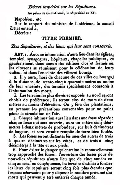 Ci fu un sollevamento popolare quando Il Bonaparte emise il famoso editto di Saint Cloud, che ordinava lo spostamento all’esterno dei centri abitati, per motivi di igiene pubblica, dei luoghi di sepoltura, da sempre adiacenti alle chiese.