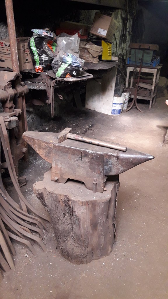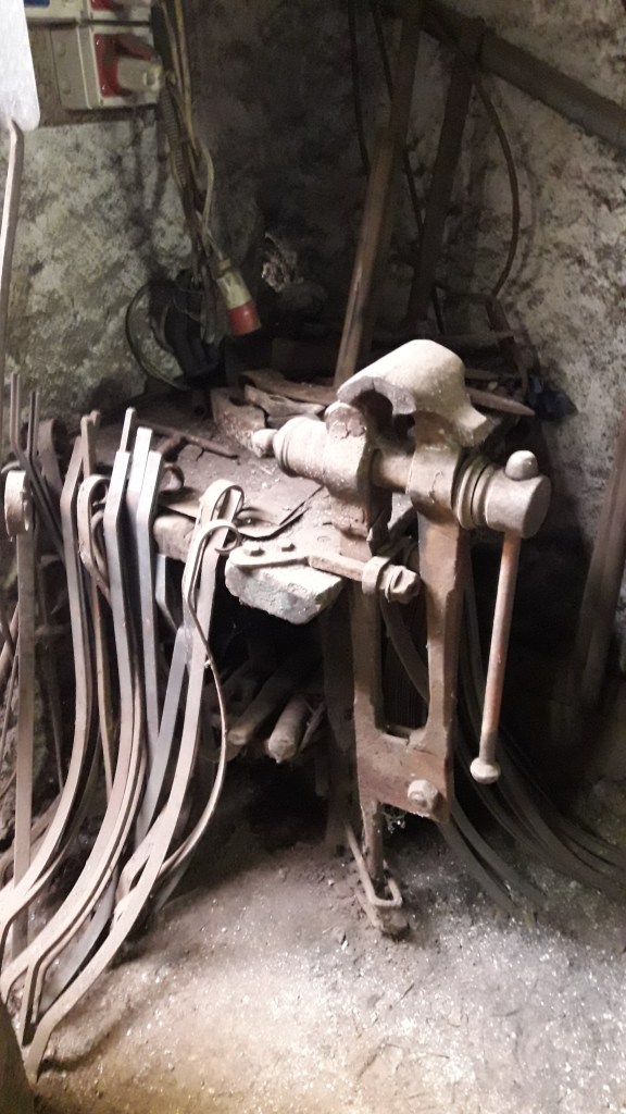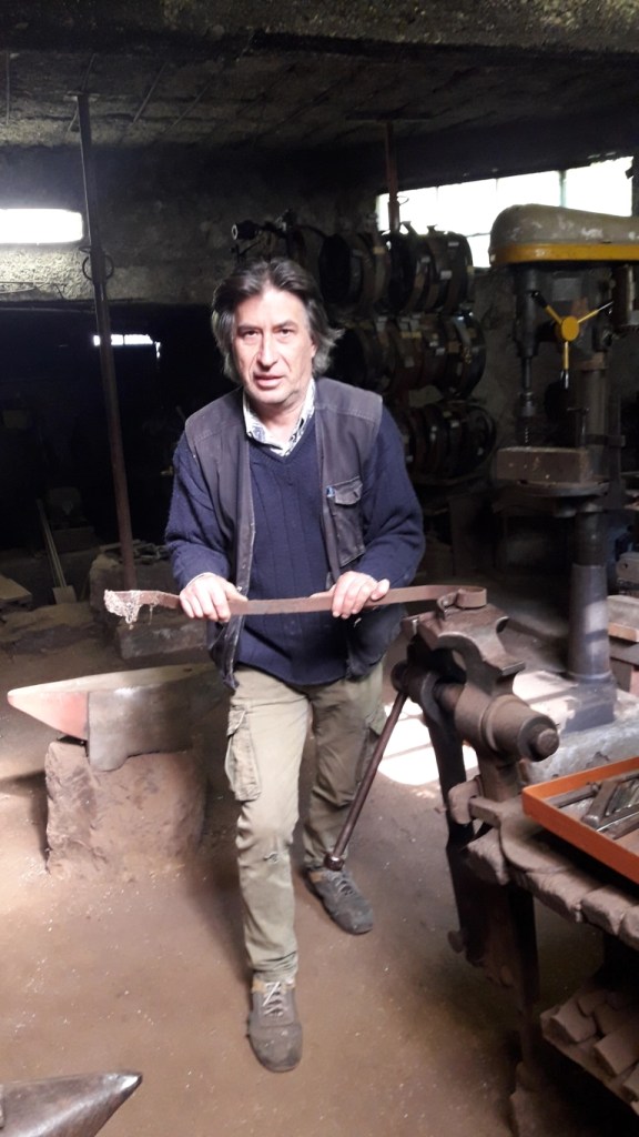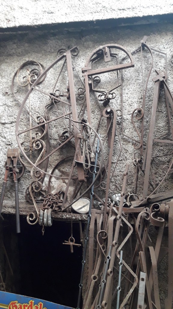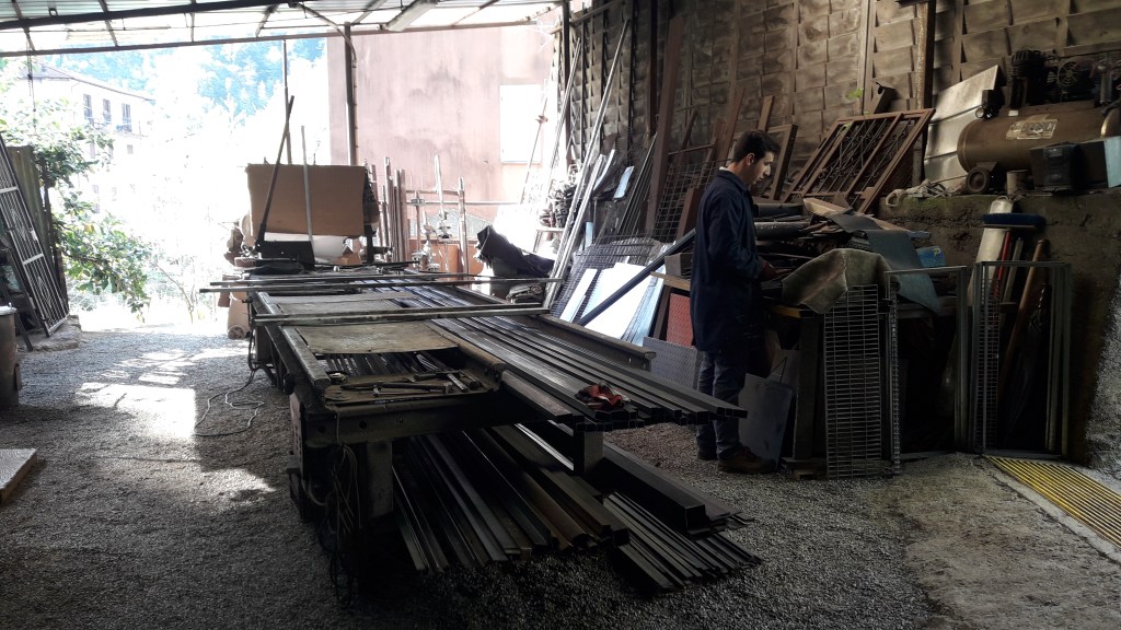 Michelino, mi guida in quello che è un vero e proprio museo di famiglia, fra morsce, banchi da travaggiu e anchise un vero e proprio spettacolo della lavorazione a caldo dell’acciaio, con gli attrezzi che erano stati costruiti da suo nonno e poi da suo papà Domenico, ancora custoditi, in un ripostiglio e in bella vista, appesi ai muri della sua fucina, ci sono le grandi tenagge per lavorare il “ferro finchè è caldo” mannaie e coltellacci per macelleria, poi ancora ferri da cavallo e poi infiniti ferri ritorti per ringhiere e cancelli, in zeneise ghirigori con le relative dime, per dargli la forma giusta.