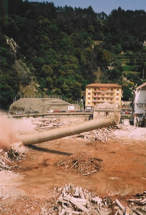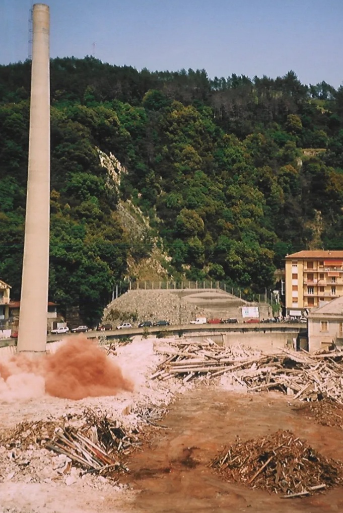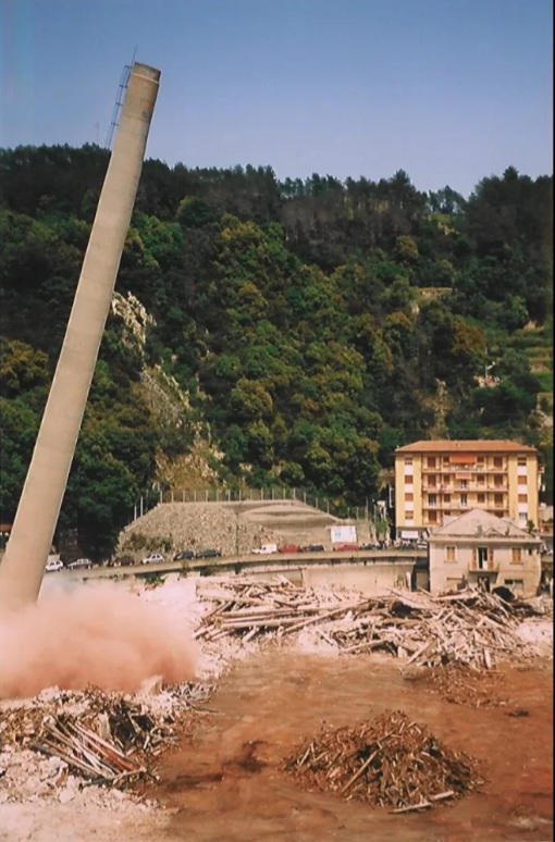 Venne abbattuta nel 1999 a seguito della costruzione del complesso residenziale di Corte di Mare, ero presente insieme a molte altre persone per l’annunciato abbattimento della ciminiera, tre suoni di sirena precedettero l’esplosione, che distrusse la base della ciminiera, la quale per alcuni istanti restò ancora in piedi, per poi precipitare al suolo, emettendo un enorme sbuffo di nerofumo, che investì le persone più vicine, spettatori e testimoni dell’abbattimento.